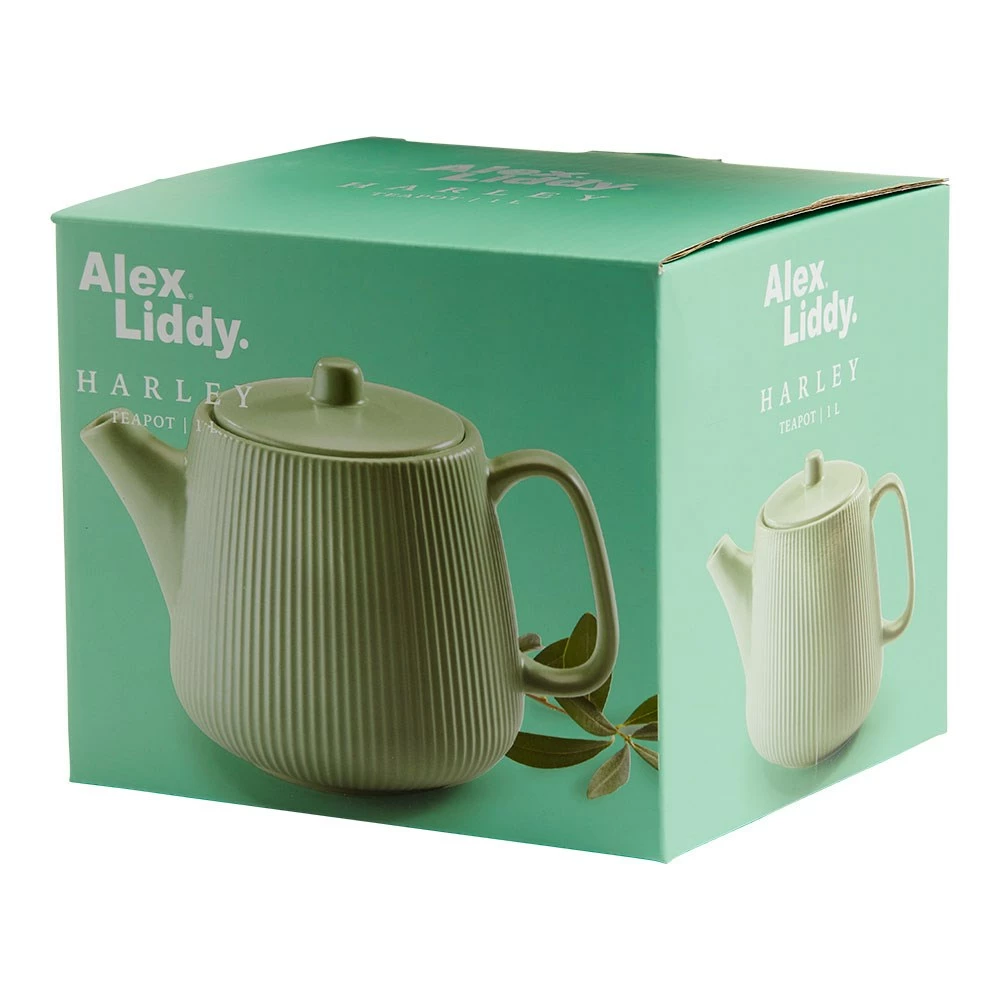 Enjoy your favourite tea with the Alex Liddy Harley II Teapot 1L in Sage. Perfect for brewing hot cups of tea, this teapot will keep your tea warm and add to the aesthetic appeal of your kitchenware collection. The Harley range, a name that means from the hares’ wood, brings you luxury products designed with woodland tones to beautify your kitchen and home. With a ribbed detail around the outside and a matte finish in a soft shade of sage green, this teapot will add a touch of luxury to your kitchen. It also makes a great gift idea, coming beautifully boxed. Pairs well with the matching Alex Liddy Harley II Set of 2 Mug 380ml Sage, sold separately.