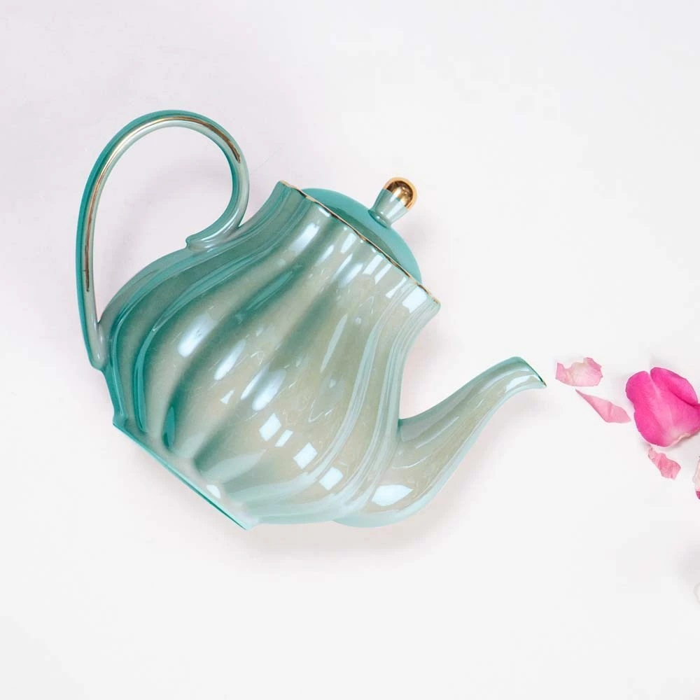 Delightful tea parties with towers of macarons are brought to life with the gorgeous Ashdene Parisienne Pearl Teapot 950ml Aquamarine. The Ashdene Parisienne Pearl Teapot 950ml Aquamarine embodies the opulent aesthetic of classic French tearooms with its delicate body and soft scalloped detailing. Crafted from elegant new bone china, the pot is glazed in a light-catching pearlescent turquoise-blue with luxurious gold accents. With its generous 950ml capacity, this teapot makes a chic serving vessel while catching up with friends and loved ones or presented as a stylish, memorable gift. Pair the Ashdene Parisienne Pearl Teapot 950ml Aquamarine with coordinating Parisienne Pearl Teacups and other tableware, offered in a charming selection of harmonious pastel colours.